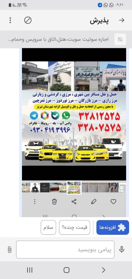 با مجوز رسمی از اتحادیه حمل و نقل و اتومبیل کرایه - ارائه خدمات حمل و نقل مسافر با خودروی سواری از تبریز به مناطق بازرگان - نوردوز .- تمرچین - رازی - سرعین و آستارا و ... -فعالیت اصلی این آژانس خدمات بین شهری می باشد